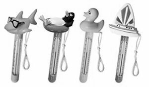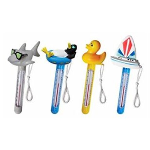 Soft molded assortment includes 4 styles (shark, penquin, duck, saliboat). Dual range Fahrenheit and Celsius scales on basic thermometer with polyethylene cord.